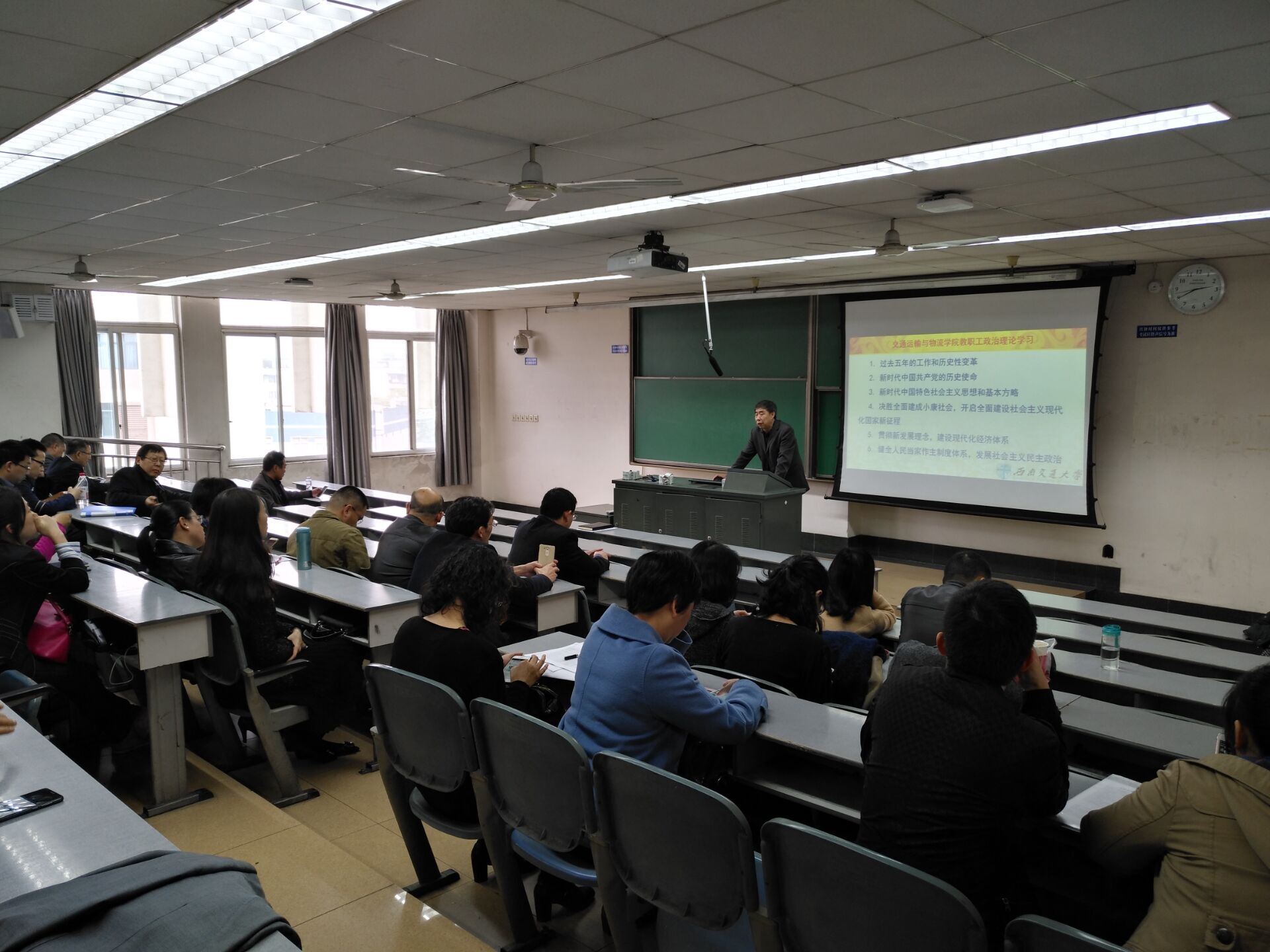 人生就是博ag(中国区)·公司官网于2017年11月9日下午2:30在九里校区逸夫馆4523教室召开全院教职工大会,专题学习习近平总书记在党的十九大开幕式上所作大会报告和会议精神。会议由公司党委郝建平书记主持。