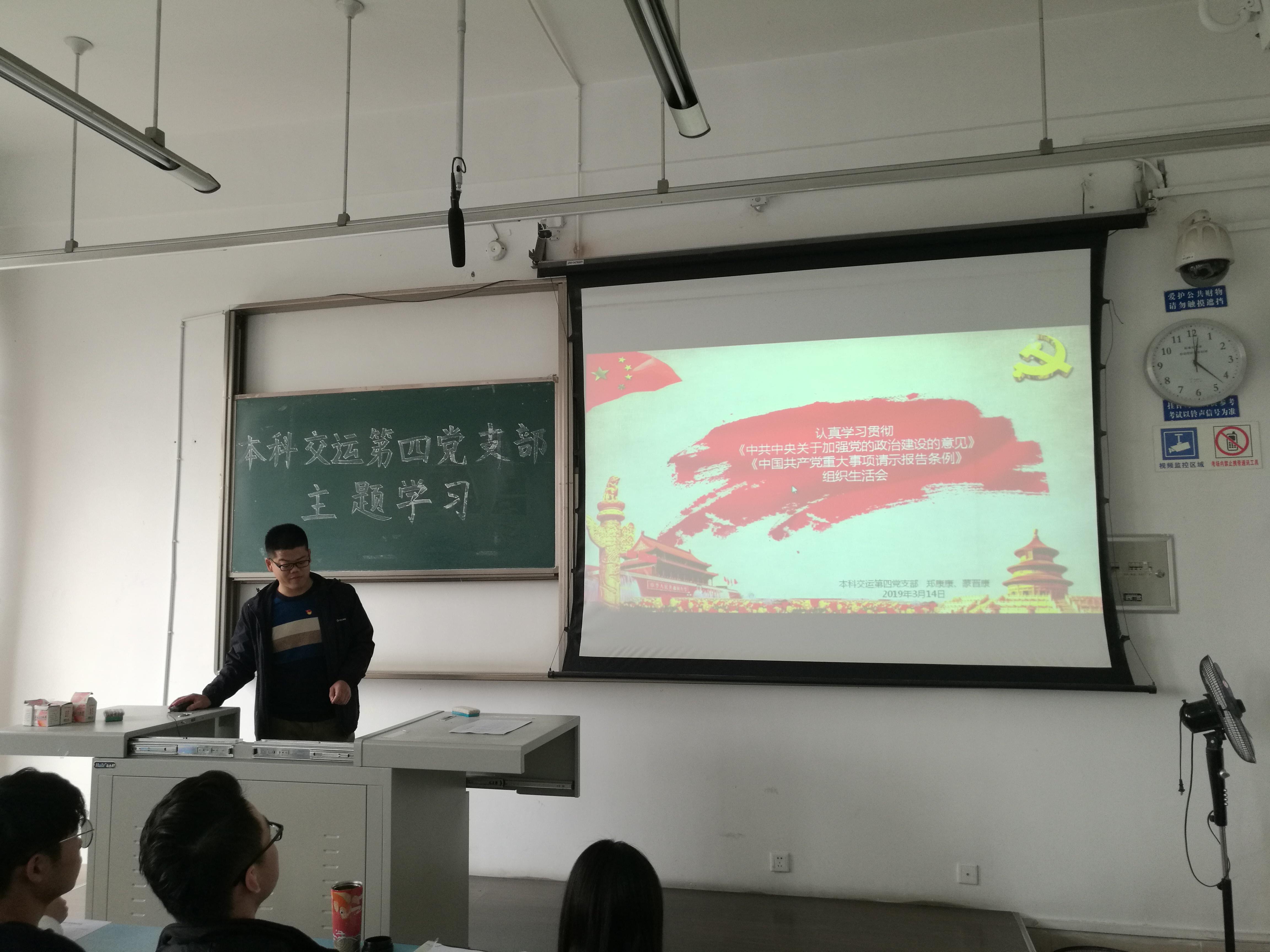 中共中央近日印发了《中共中央关于加强党的政治建设的意见》(以下简称《意见》)和《中国共产党重大事项请示报告条例》(以下简称《条例》),为认真组织学习《意见》《条例》,使广大党员准确把握重要意义、主要内容和工作要求,深刻认识到《意见》对加强党的政治建设做出重要部署的重要意义和《条例》对于坚决做到“两个维护”、保证全党团结统一和行动一致的重要意义。2019年3月14日,本科交运第四党支部在X2423教室集中开展“认真学习贯彻《中共中央关于加强党的政治建设的意见》和《中国共产党重大事项请示报告条例》”组织生活会,重点学习和解读了《意见》和《条例》具体内容和要求。本次活动由支部郑康康同志主持。