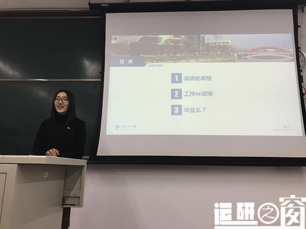 作为一名辅导员,同时也是一名研二的员工,郭老师更多的是以一个学姐的身份来和研一新生分享她在研究生阶段的一些感悟和收获。郭老师主要从三个方面来讲述研究生阶段的生涯规划问题:第一个方面是明确自己“读研的原因”,因为读研的原因直接决定了生涯规划的方向,正如习近平总书记提出 “不忘初心,砥砺前行”;第二个方面是“毕业后的想法”,新生入学后应该对毕业后是工作还是继续读博思考清楚,早做打算;第三个方面是“带着什么毕业”,郭老师认为同学、朋友、师门之间的情谊和各位同学在研究生阶段拼尽全力获取的荣誉都是读研期间宝贵的人生财富。