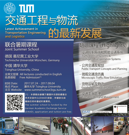 今年,清华大学交通研究所拟于7月24日-8月4日举办第十一期“清华大学-慕尼黑工大暑期学校”,主题为“交通工程与物流的最新发展”。教授阵容由清华大学交通研究所陆化普教授和慕尼黑工业大学布什教授领衔组成,教学内容涵盖交通规划与控制、智能交通系统和货物运输及物流等领域前沿知识。