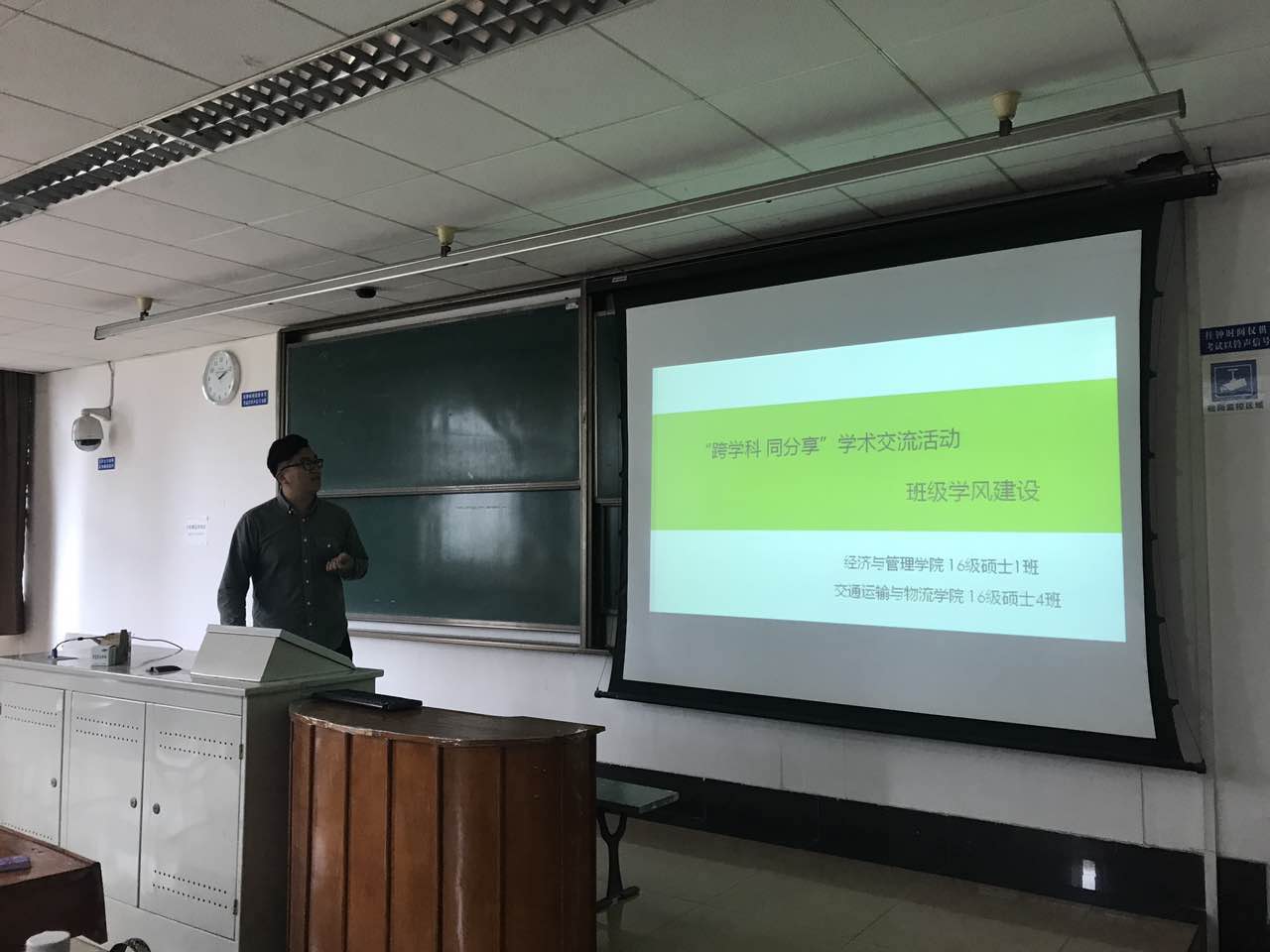 首先,两位班长分别对班级情况进行了简要介绍。随后,由各班同学代表从各自的专业出发,根据自身学术研究方向,进行了简要的主题报告。首先由交运4班团支书赵美怡同学进行分享,她以“交通运输业与国民经济关系的数量分析”为题,从交通运输学科的专业知识背景出发,由浅入深进行了介绍。接下来经管学院硕士1班的景兰同学以四川省为例,介绍了人口迁移与区域经济发展的关系。最后由刘杰同学以自己即将发表的论文“铁路网络的抗毁性分析研究”为引,对论文内容做了简要介绍,并着重分享了自己在论文构思、论文撰写、论文投递发表过程中的经验与收获。