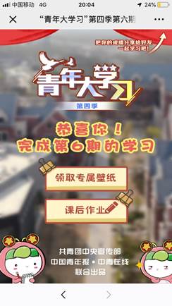 支部成员关注“天府新青年”微信公众号,进入公众号后点击底部菜单栏中的“大学习”进入学习界面,学习登记时选择“人生就是博ag(中国区)·公司官网”-“人生就是博ag(中国区)·公司官网”。各支部成员从本周更新的学习内容(即第四季第六期)进行学习签到,学习内容每周更新一期。各团支部成员完成学习后将每期学习完成界面截图发送至各支部负责人,各支部负责人在每周六中午12:00前将本团支部成员打卡截图汇总打包(命名格式:压缩包命名-201*级XXn班团课学习,个人学习截图以姓名命名)发送至交运团委邮箱(邮箱地址:swjtu_jytw@163.com)。学院团委将统计各支部团课完成情况,各支部90%以上成员打卡记为优秀,80%以上成员打卡记为合格,不合格的团支部(即班级打卡人数低于80%)需重新学习。各团支部学习情况将纳入后期团支部考核,完成情况差的支部和个人,将取消五四表彰资格,同时,学院团委会对未完成团课的支部进行指导教育。望各支部重视并落实到位!