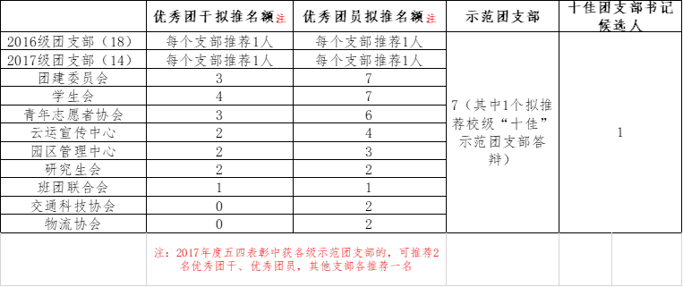 1.优秀个人采取差额评选方式,根据拟推荐名额分配表,以团支部、团学组织为单位进行民主评选。要求推选人员参评年度各类课程无正考不及格,且2017-2018学年综合测评成绩符合相应成绩排名范围的要求,请各推荐单位认真审核拟推荐人员评选资格。如推荐人员经学院审核不满足条件、为无效推荐,将考虑相关推荐单位下一年度对应减少推荐名额。