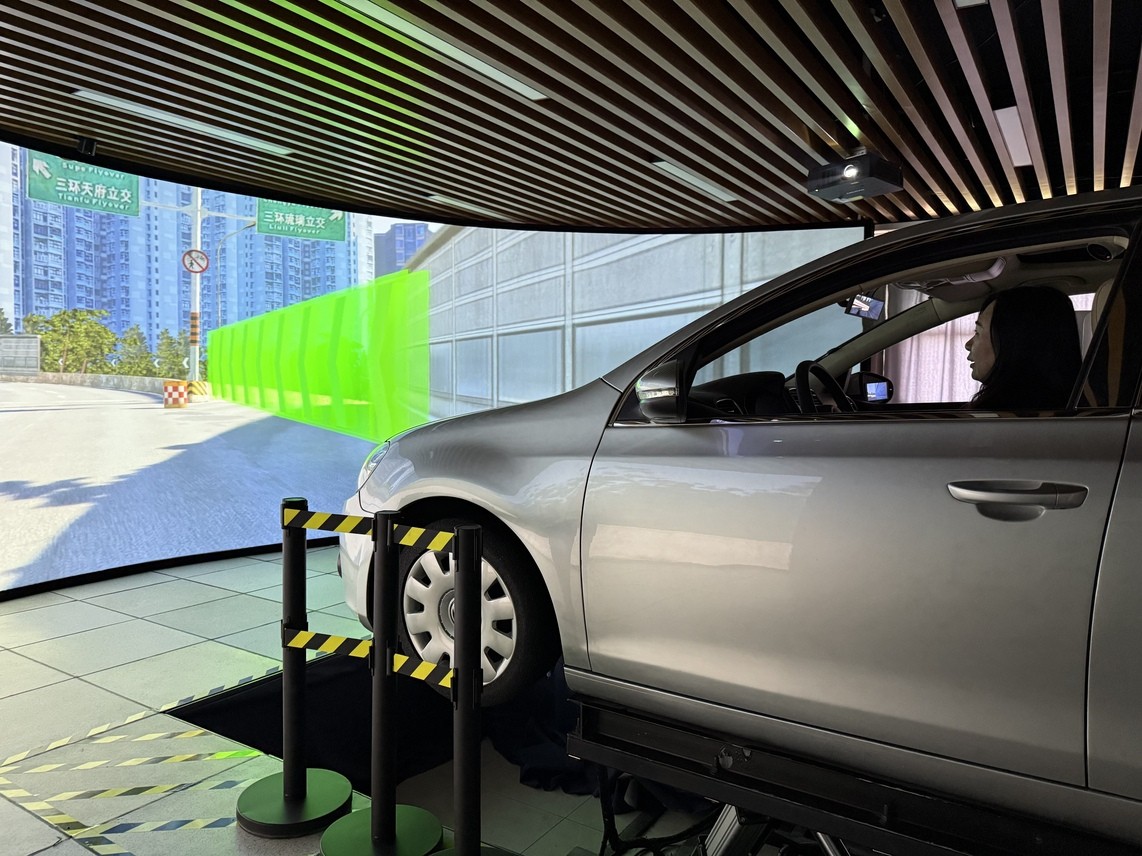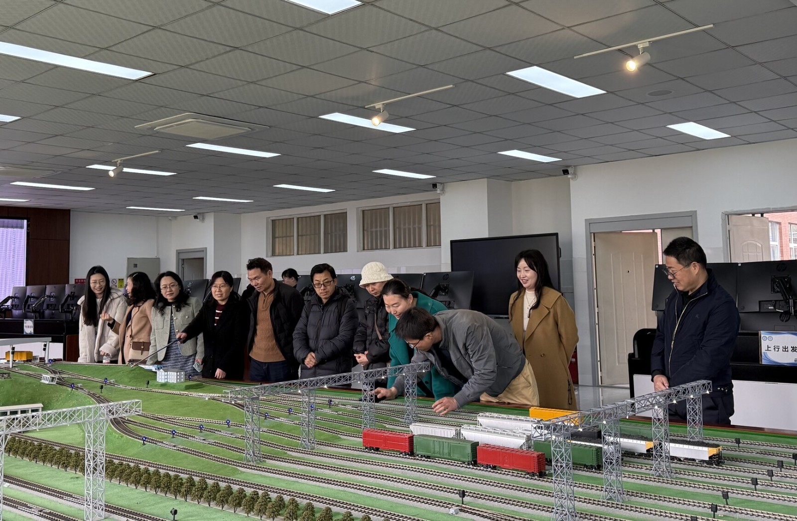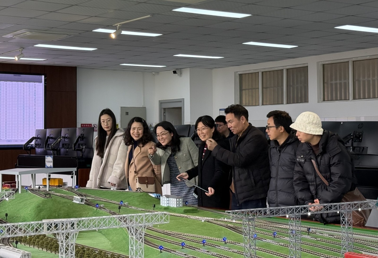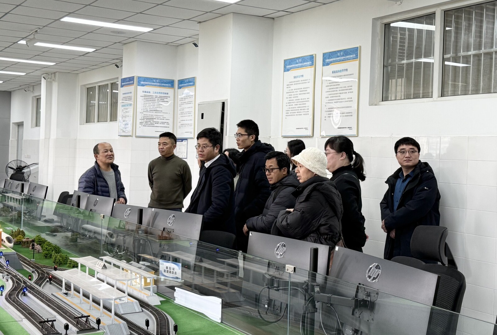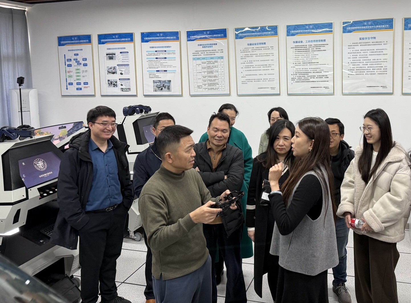各位老师依次参观了交通运输人因安全实验室、综合铁路枢纽实验室、交通安全协同仿真实验室以及铁路编组站综合作业仿真实验室。实验中心老师通过系统演示、虚实结合操作等方式,全方位展示实验室的仿真实验系统与教学应用场景。在交通运输人因安全人实验室,教师们积极参与到交通安全适应性检测和数据采集实验中;在交通安全协同仿真实验室,教师们亲身体验六自由度驾驶模拟器在混合现实场景下的协同驾驶;铁路编组站综合作业仿真实验室里,教师在成都北编组站沙盘和实时动态数据大屏前展开热烈讨论;综合铁路枢纽实验室里,老师们认真研究大型综合交通枢纽沙盘的仿真操作。