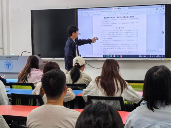 最后,全体成员共同学习了《普通高等学校员工(研究生)代表大会工作规定》。刘鑫洋系统讲解了员工代表大会的职权、代表产生方式、会议组织流程及提案工作机制,强调了员工代表大会在参与学校治理、保障同学权益中的重要作用。他结合实例,说明了代表的权利义务、常设机构的职能以及大会召开的规范要求,引导成员依法依规行使民主权利。
