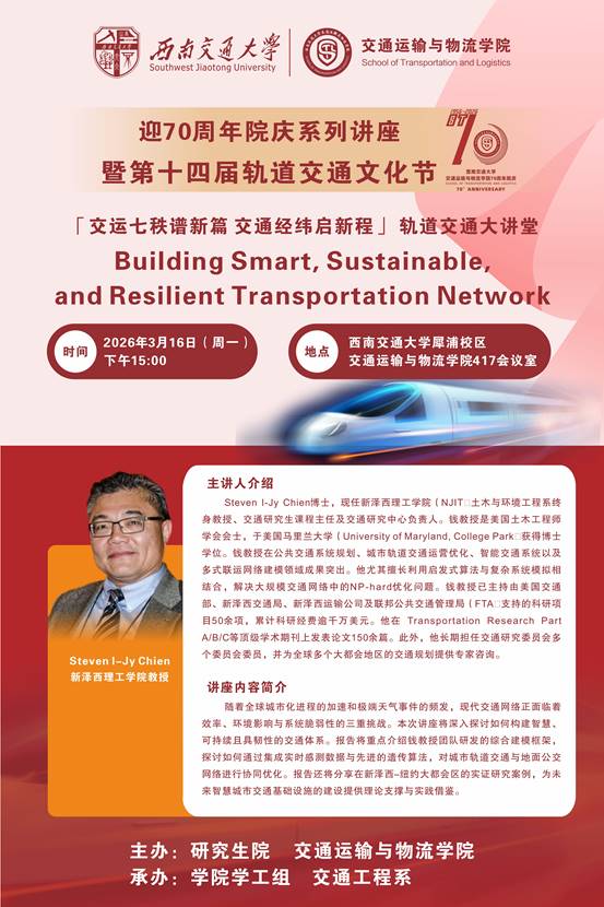 随着全球城市化进程的加速和极端天气事件的频发,现代交通网络正面临着效率、环境影响与系统脆弱性的三重挑战。本次讲座将深入探讨如何构建智慧、可持续且具韧性的交通体系。报告将重点介绍钱教授团队研发的综合建模框架,探讨如何通过集成实时感测数据与先进的遗传算法,对城市轨道交通与地面公交网络进行协同优化。报告还将分享在新泽西-纽约大都会区的实证研究案例,为未来智慧城市交通基础设施的建设提供理论支撑与实践借鉴。