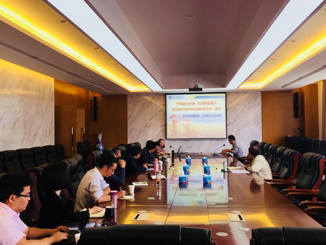 2018年9月26日上午9:00,在犀浦校区交运楼417会议室召开了公司党政联席会暨党委中心组学习会议,会议分成两个部分,第一部分党政班子就一体化等相关工作做了研讨和商议,第二部分主要由公司党委副书记兼纪委书记李国芳同志以《严明政治纪律,扎紧制度笼子,坚决维护党中央权威和集中统一领导》为题,带领大家学习了最新修订后的《中国共产党纪律处分条例》(以下简称《条例》)。李书记带领大家回顾自首次印发以来《条例》历次的修订情况,向大家详细解读本次《条例》修订的主要内容,以及修订内容的重要特征。她强调,最新修订的《条例》的一个鲜明特点就是突出政治性,把坚决维护党中央权威和集中统一领导作为出发点和落脚点。此外,李书记还结合《条例》内容就学校、学院层面的纪委工作为大家进行讲解,使大家进一步了解纪委的工作内容和工作流程。